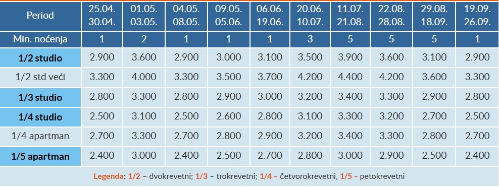 Cene u drugoj tabeli cena su izražene u dinarima PO OSOBI, DNEVNO na bazi POLUPANSIONA (doručak i večera).