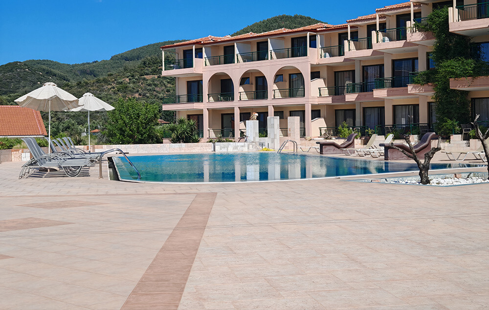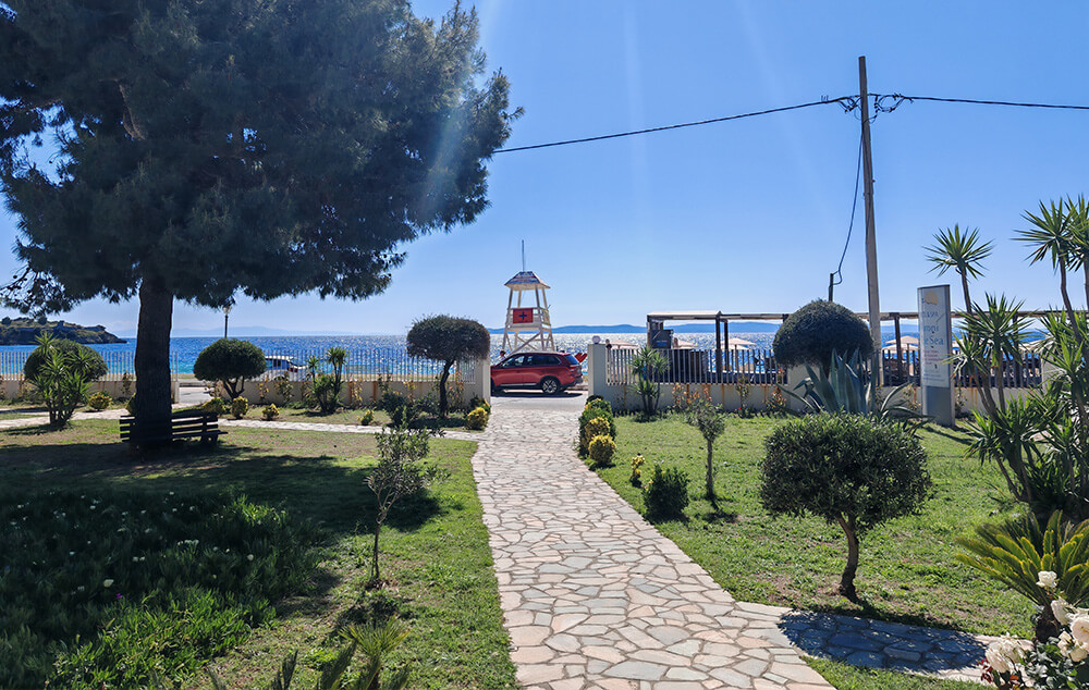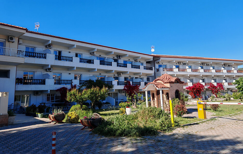 Kuća Basil Toroni nalazi se na samoj plaži, u sklopu hotela Blue Sea. U ponudi su studiji i apartmani za 2-4 osobe koji se nalaze u prizemlju, na prvom i drugom spratu. Jedni su sa bočnim pogledom na more, a drugi povoljniji nemaju pogled na more. Sve smeštajne jedinice imaju TV i klima uređaj čije je korišćenje uključeno u cenu. Gostima su na raspolaganju veliki i dečiji bazen uz konzumaciju pića, kao i parking. Moguća je doplata polupansiona u hotelskom restoranu.