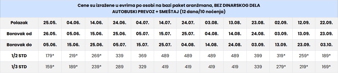 CENE SU IZRAŽENE PO OSOBI NA BAZI PAKET ARANŽMANA (smeštaj i prevoz) ZA POLASKE IZ BEOGRADA, NOVOG SADA I DUŽ AUTO PUTA.
