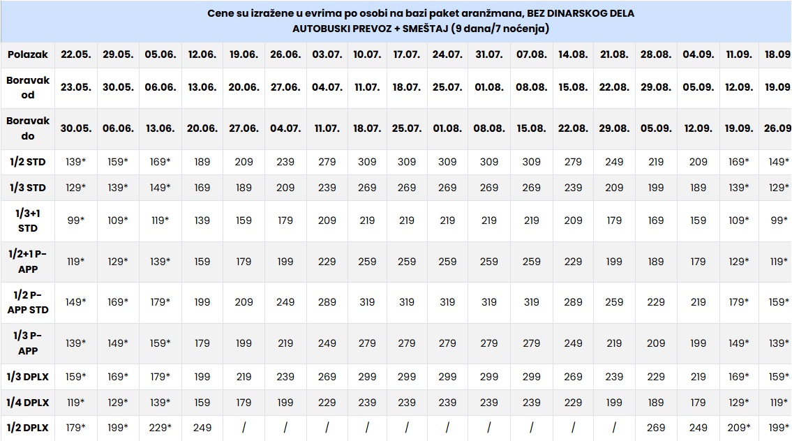 CENE SU IZRAŽENE PO OSOBI NA BAZI PAKET ARANŽMANA (smeštaj i prevoz) ZA POLASKE IZ BEOGRADA, NOVOG SADA I DUŽ AUTO PUTA.