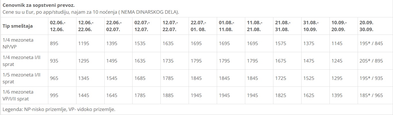 -Kod prodaje duple smene – prva smena gde je cena sa zvezdicom (*) i narednog termina, putnik plaća paket po osobi plus najam apartmana u sledećoj smeni. Isto važi i za poslednju smenu sa zvezdicom (*).