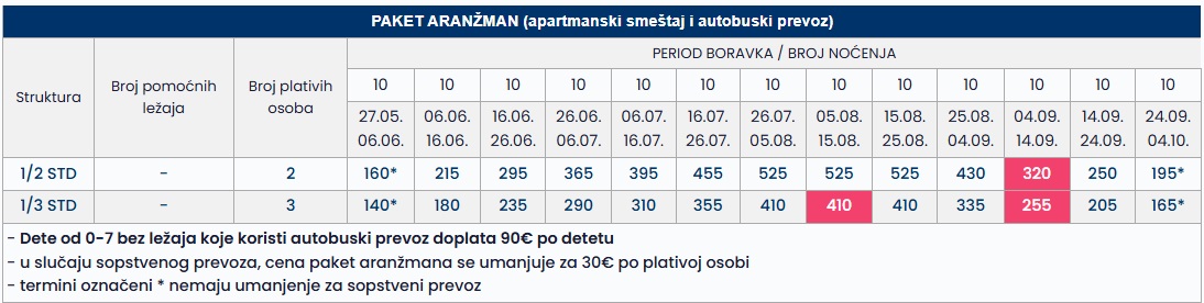 •Datum iz tabele se odnosi na period boravka. Polazak autobusa je dan ranije u odnosu na datum iz tabele.