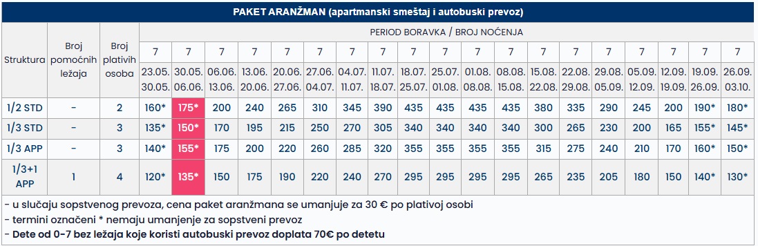 •Datum iz tabele se odnosi na period boravka. Polazak autobusa je dan ranije u odnosu na datum iz tabele.