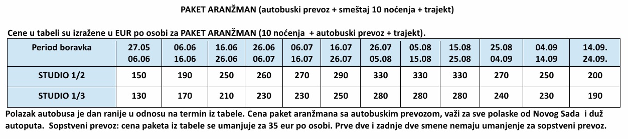 Cene iz tabele su date u evrima kao jedinstveni paket aranžman po osobi, sa prevozom.