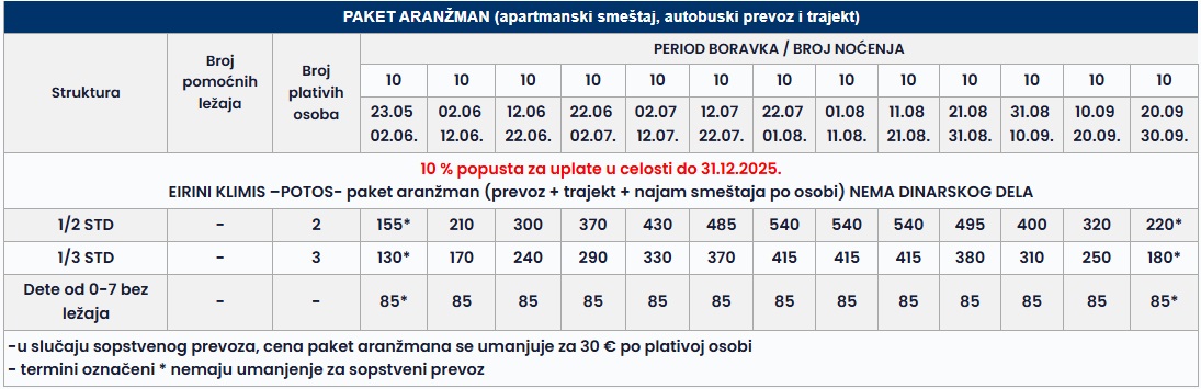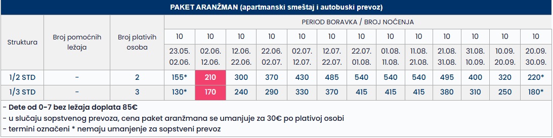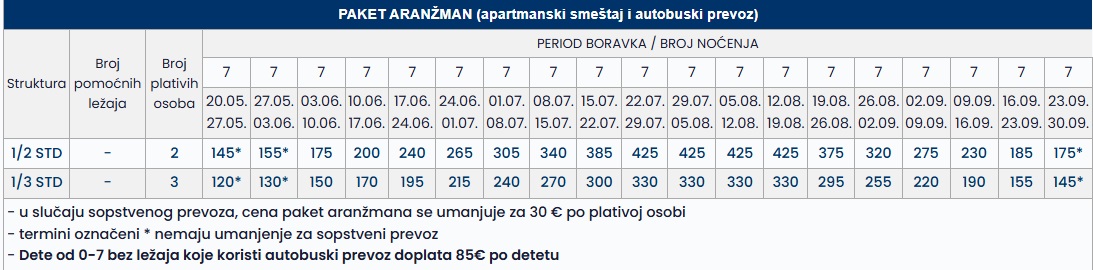 •Datum iz tabele se odnosi na period boravka. Polazak autobusa je dan ranije u odnosu na datum iz tabele.