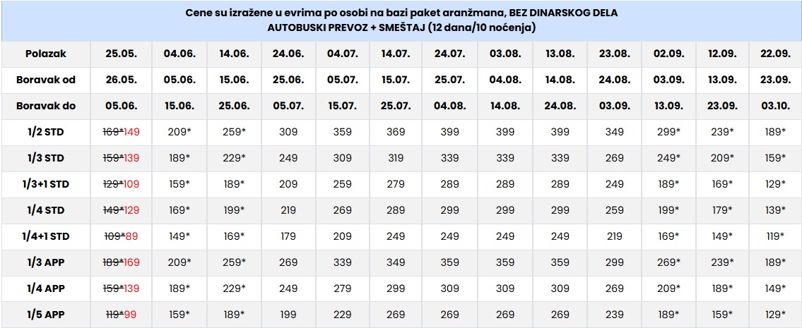 Kod akcijskih cena (označene crvenom bojom u tabeli), umanjenje za sopstveni prevoz je 20€, a umanjenja za decu nema