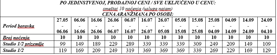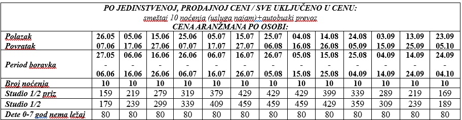 ARANŽMAN OBUHVATA za autobuski prevoz: Smeštaj u studijima/apartmanima na bazi 10 noćenja, autobuski prevoz iz Beograda, usluge predstavnika agencije i organizacije putovanja.