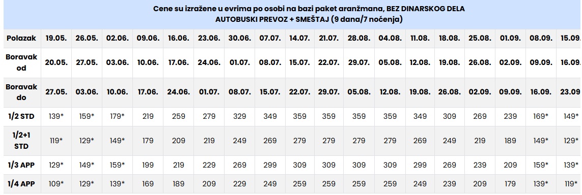 CENE SU IZRAŽENE PO OSOBI NA BAZI PAKET ARANŽMANA (smeštaj i prevoz) ZA POLASKE IZ BEOGRADA, NOVOG SADA I DUŽ AUTO PUTA.