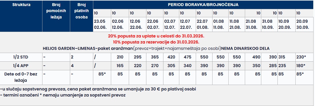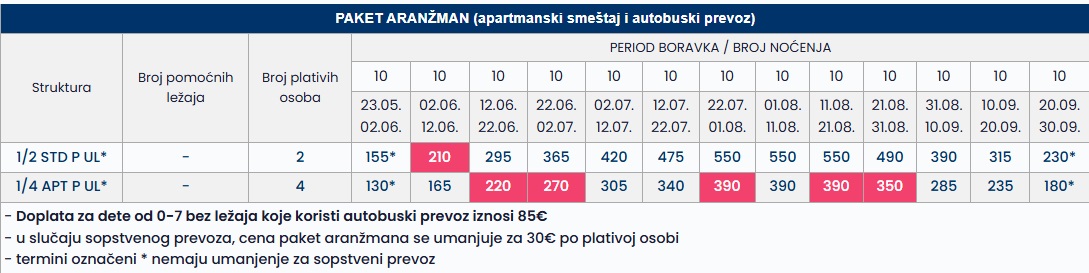 •Datum iz tabele se odnosi na period boravka. Polazak autobusa je dan ranije u odnosu na datum iz tabele.