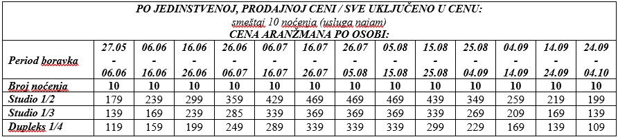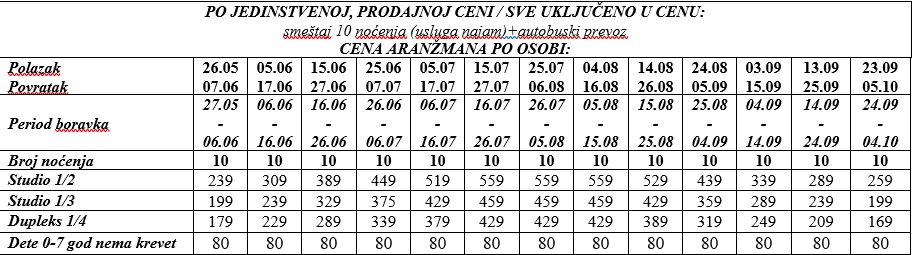 ARANŽMAN OBUHVATA za autobuski prevoz: Smeštaj u studijima/apartmanima na bazi 10 noćenja, autobuski prevoz iz Beograda, usluge predstavnika agencije i organizacije putovanja.