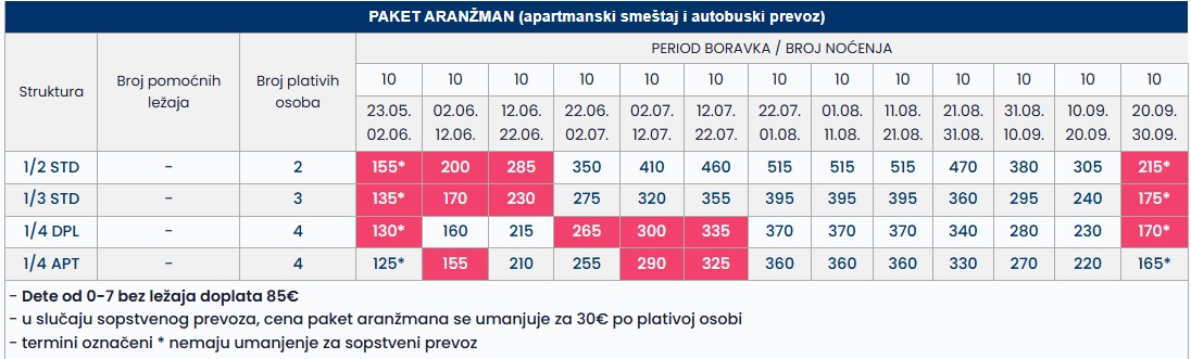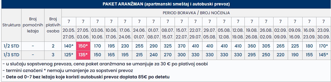 •Datum iz tabele se odnosi na period boravka. Polazak autobusa je dan ranije u odnosu na datum iz tabele.