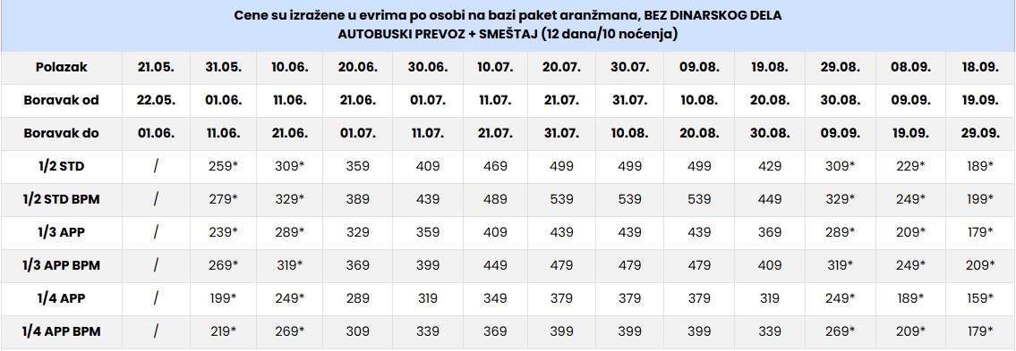 CENE SU IZRAŽENE PO OSOBI NA BAZI PAKET ARANŽMANA (smeštaj i prevoz) ZA POLASKE IZ BEOGRADA, NOVOG SADA I DUŽ AUTO PUTA.