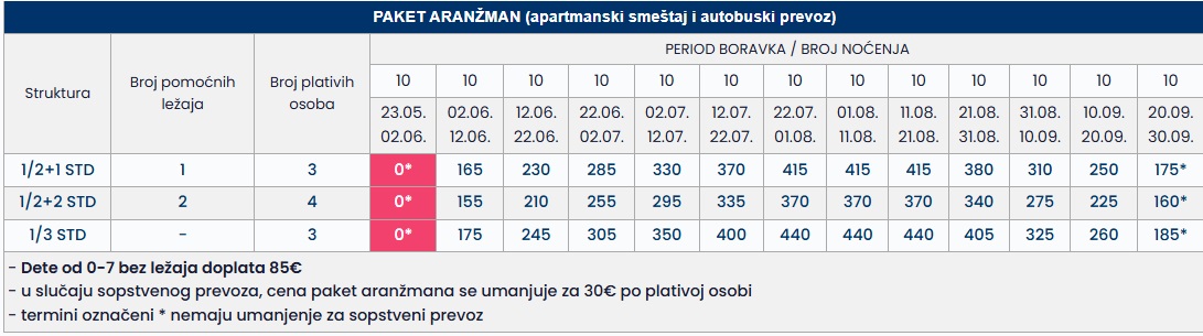 •Datum iz tabele se odnosi na period boravka. Polazak autobusa je dan ranije u odnosu na datum iz tabele.