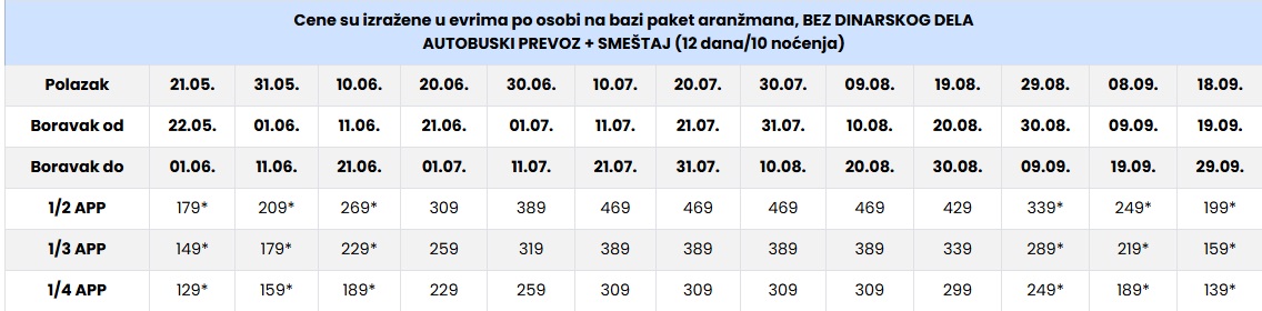 CENE SU IZRAŽENE PO OSOBI NA BAZI PAKET ARANŽMANA (smeštaj i prevoz) ZA POLASKE IZ BEOGRADA, NOVOG SADA I DUŽ AUTO PUTA.