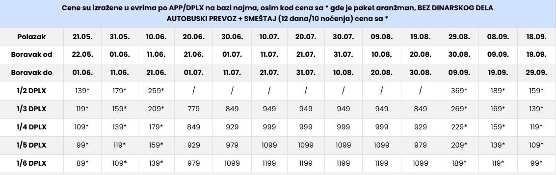 Smene od 21.06. do 30.08.2026. su po APP/DPLX – 10 noćenja
