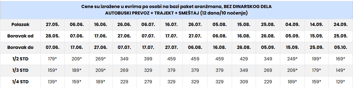 CENE SU IZRAŽENE PO OSOBI NA BAZI PAKET ARANŽMANA (smeštaj i prevoz) ZA POLASKE IZ BEOGRADA, NOVOG SADA I DUŽ AUTO PUTA.