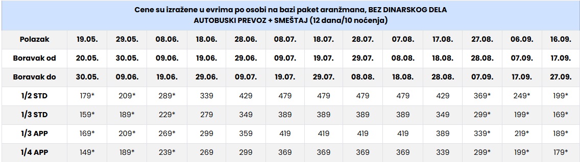 CENE SU IZRAŽENE PO OSOBI NA BAZI PAKET ARANŽMANA (smeštaj i prevoz) ZA POLASKE IZ BEOGRADA, NOVOG SADA I DUŽ AUTO PUTA.
