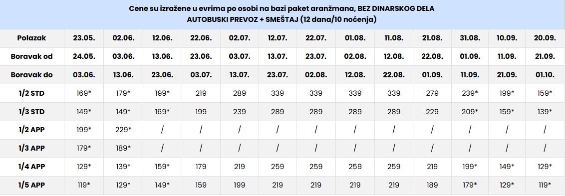 CENE SU IZRAŽENE PO OSOBI NA BAZI PAKET ARANŽMANA (smeštaj i prevoz) ZA POLASKE IZ BEOGRADA, NOVOG SADA I DUŽ AUTO PUTA.
