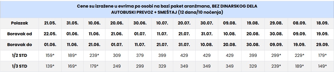 CENE SU IZRAŽENE PO OSOBI NA BAZI PAKET ARANŽMANA (smeštaj i prevoz) ZA POLASKE IZ BEOGRADA, NOVOG SADA I DUŽ AUTO PUTA.
