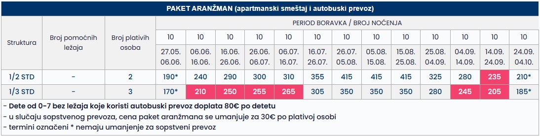 Datum iz tabele se odnosi na period boravka. Polazak autobusa je dan ranije u odnosu na datum iz tabele.