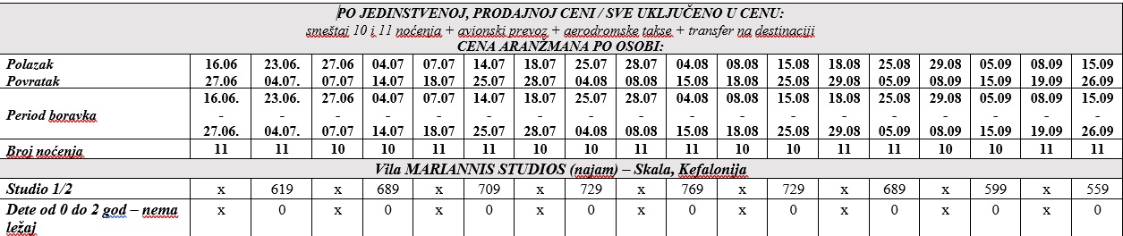 1.Dan – Beograd – Kefalonija. Sastanak putnika na aerodromu Nikola Tesla u Beogradu, u holu za međunarodne polaske, 2 SATA PRE ZVANIČNO OBJAVLJENOG VREMENA POLETANJA AVIONA. Prevoz avionom (čarter let) na relaciji Beograd – Kefalonija (let traje oko 1h i 30 min ). Po sletanju, transfer do izabranog smeštaja. Smeštaj od 15:00 časova. Noćenje