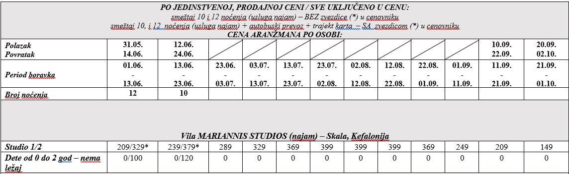 PROGRAM PUTOVANJA AUTOBUSOM OBUHVATA: Smeštaj u studijima/apartmanima na bazi 10/12 noćenja, autobuski prevoz iz Beograda, povratna trajekt karta, usluge predstavnika organizatora aranžmana ili ino-partnera na destinaciji, troškovi organizacije i vođenja aranžmana.