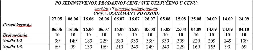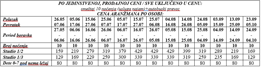 ARANŽMAN OBUHVATA za autobuski prevoz: Smeštaj u studijima/apartmanima na bazi 10 noćenja, autobuski prevoz iz Beograda, usluge predstavnika agencije i organizacije putovanja.