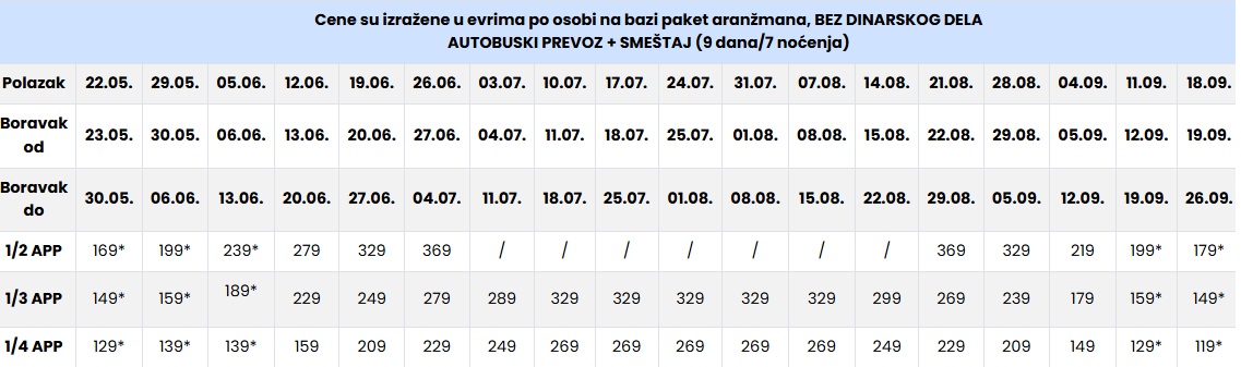 CENE SU IZRAŽENE PO OSOBI NA BAZI PAKET ARANŽMANA (smeštaj i prevoz) ZA POLASKE IZ BEOGRADA, NOVOG SADA I DUŽ AUTO PUTA.