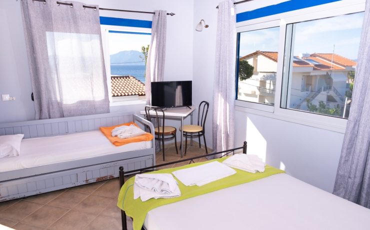 Raspolaže dvokrevetnim i trokrevetnim studijima i četvorokrevetnim apartmanima. Pogled iz studija i apartmana je na ulicu, direktan pogled more ili bočni pogled more.