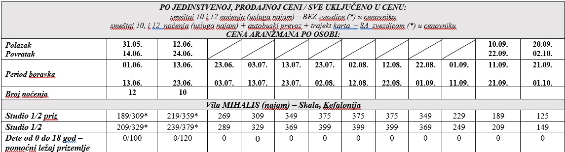 PROGRAM PUTOVANJA AUTOBUSOM OBUHVATA: Smeštaj u studijima/apartmanima na bazi 10/12 noćenja, autobuski prevoz iz Beograda, povratna trajekt karta, usluge predstavnika organizatora aranžmana ili ino-partnera na destinaciji, troškovi organizacije i vođenja aranžmana.