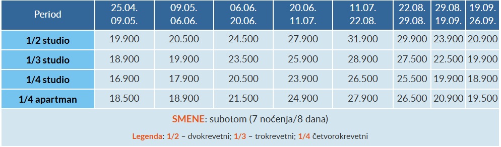Cene u prvoj tabeli cena su izražene u dinarima po osobi na bazi 7 polupansiona (doručak i večera) – 7 noćenja/8 dana.