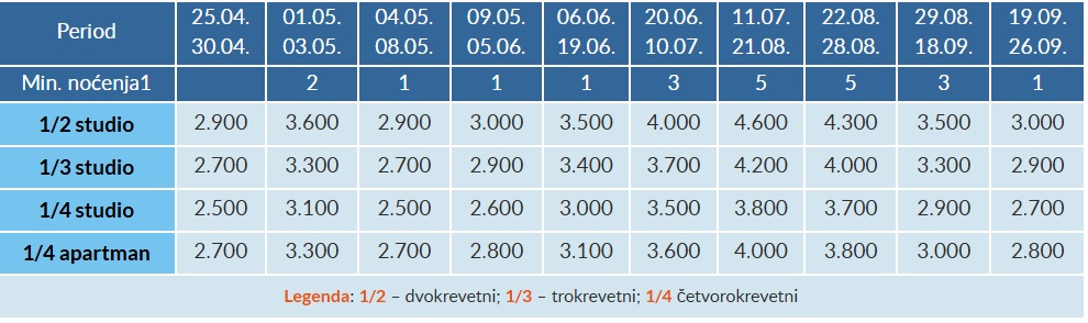 Cene u prvoj tabeli cena su izražene u dinarima PO OSOBI, DNEVNO na bazi POLUPANSIONA (doručak i večera).