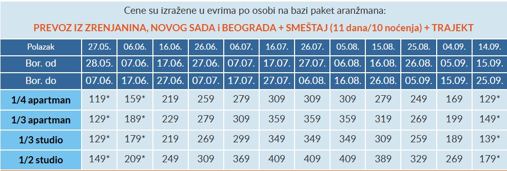 U slučaju spajanja smena na organizovanom prevozu, cena aranžmana za drugu smenu se umanjuje za 55 eur po osobi, osim za smene koje su u tabeli označene zvezdicom (*) gde se u slučaju spajanja smena cena umanjuje 35 € po osobi.