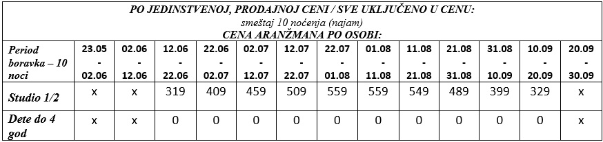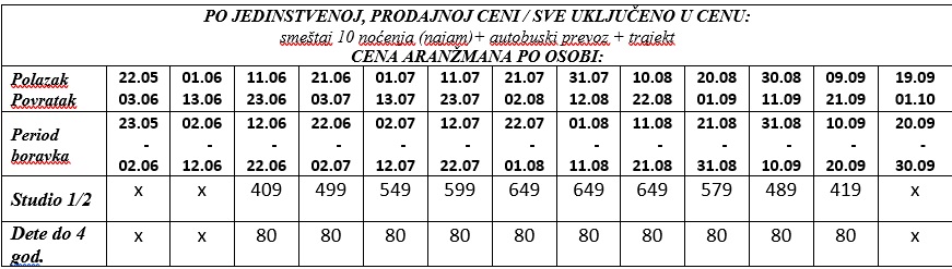 ARANŽMAN OBUHVATA autobuskim prevozom: Smeštaj u studijima/apartmanima na bazi 10 noćenja, autobuski prevoz iz Beograda, usluge predstavnika agencije i organizacije putovanja.