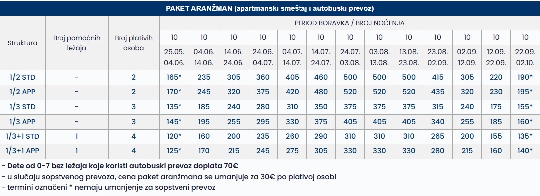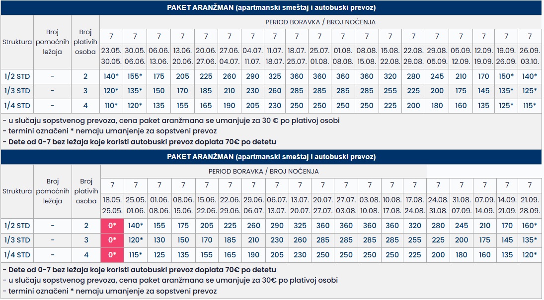•Datum iz tabele se odnosi na period boravka. Polazak autobusa je dan ranije u odnosu na datum iz tabele.