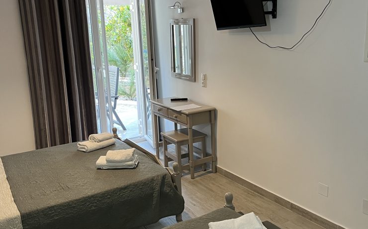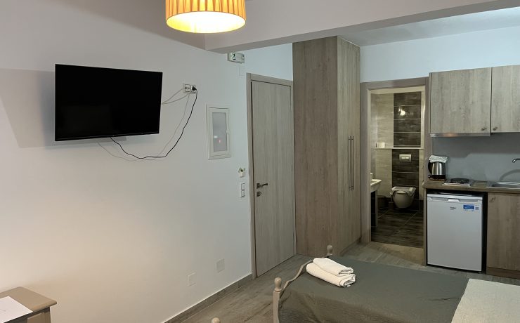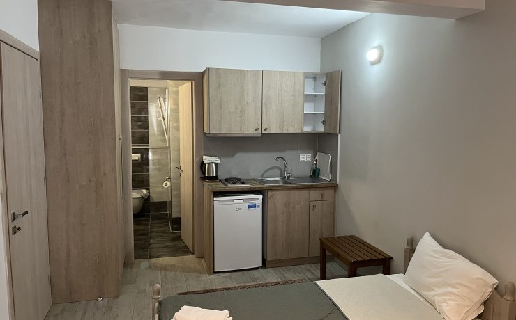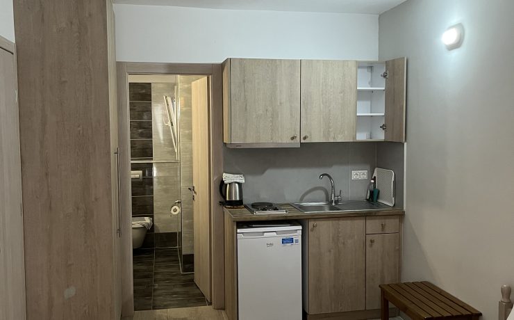 Dvokrevetni studio u svom sastavu poseduje francuski ležaj, ili dva singl ležaja, orman, TV sa lokalnim kanalima, klima uređaj, noćni stočić sa ogledalom, dva stočića pored kreveta i kuhinjskim delom, aspiratorom i frižiderom, ketlerom, kao i posuđem za dve osobe. Trokrevetni studio u svom sastavu poseduje francuski ležaj, ili dva singl ležaja i još jednan singl ležajem, orman, TV sa lokalnim kanalima, klima uređaj, noćni stočić sa ogledalom, dva stočića pored kreveta i kuhinjskim delom, aspiratorom i frižiderom, ketlerom, kao i posuđem za dve osobe. Kupatila su u svim studijima potpuno renovirana, a u svom sastavu imaju tuš kabinu. Iz oba studija se izlazi na lepe i prostrane terase na kojoj su stolovi sa dve i tri stolice.