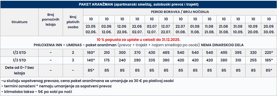 •Datum iz tabele se odnosi na period boravka. Polazak autobusa je dan ranije u odnosu na datum iz tabele.