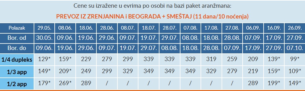 U slučaju spajanja smena na organizovanom prevozu, cena aranžmana za drugu smenu se umanjuje za 40 eur po osobi, osim za smene koje su u tabeli označene zvezdicom (*) gde se u slučaju spajanja smena cena umanjuje 30 € po osobi.