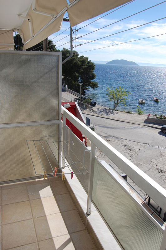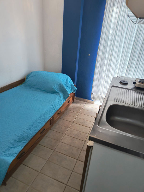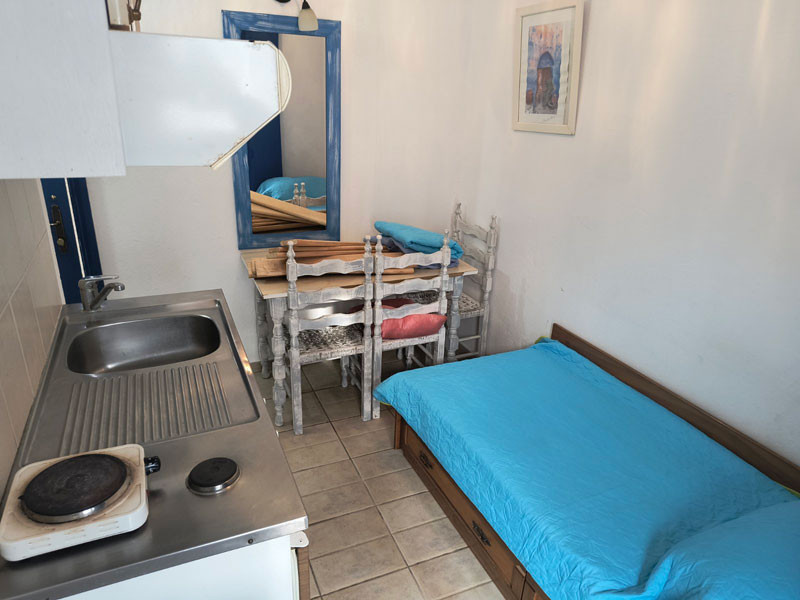 Trokrevetni apartman (1/3 app) – ulaz u trpezariju sa kuhinjom i jednim standardnim ležajem, spavaća soba sa francuskim ležajem i izlazom na terasu.