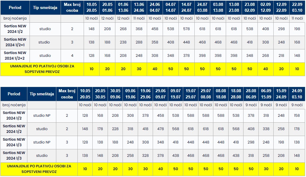 Cena u tabeli predstavlja paket aranžman (smeštaj+prevoz) po osobi.