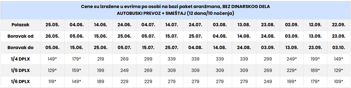 CENE SU IZRAŽENE PO OSOBI NA BAZI PAKET ARANŽMANA (smeštaj i prevoz) ZA POLASKE IZ BEOGRADA, NOVOG SADA I DUŽ AUTO PUTA.