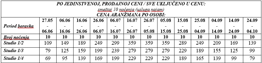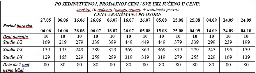 ARANŽMAN OBUHVATA za autobuski prevoz: Smeštaj u studijima/apartmanima na bazi 10 noćenja, autobuski prevoz iz Beograda, usluge predstavnika agencije i organizacije putovanja.