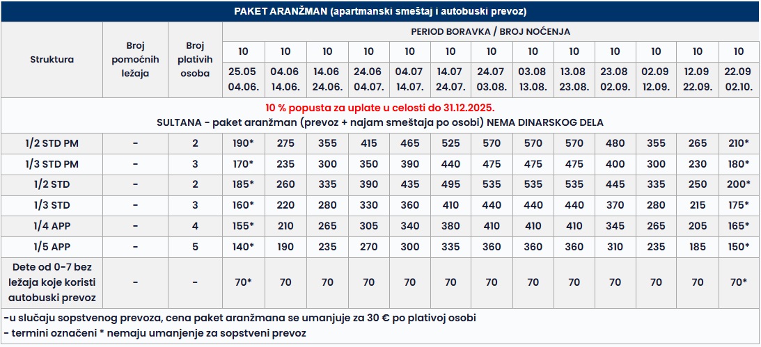 •Datum iz tabele se odnosi na period boravka. Polazak autobusa je dan ranije u odnosu na datum iz tabele.