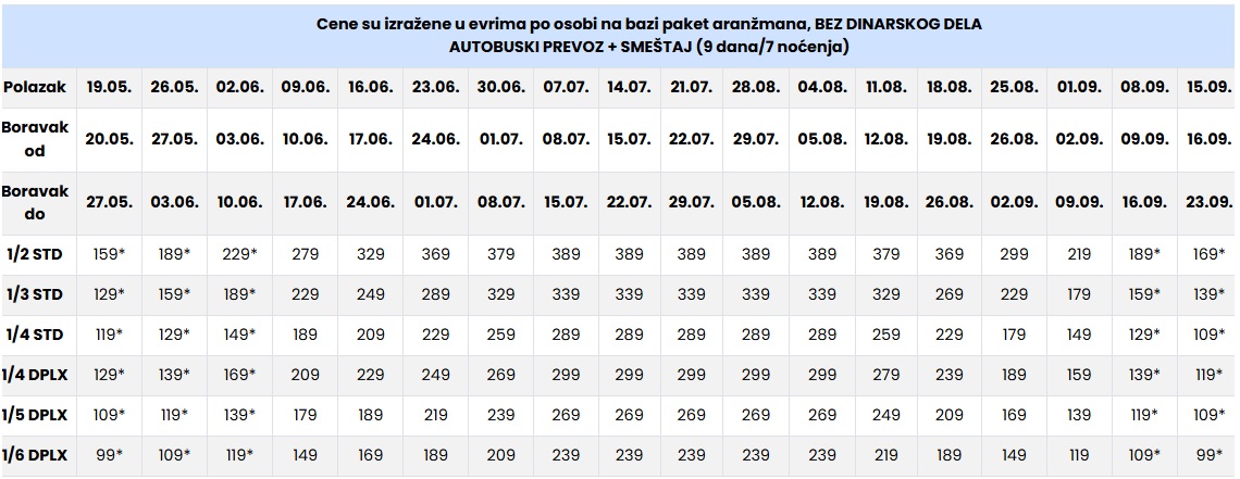 CENE SU IZRAŽENE PO OSOBI NA BAZI PAKET ARANŽMANA (smeštaj i prevoz) ZA POLASKE IZ BEOGRADA, NOVOG SADA I DUŽ AUTO PUTA.