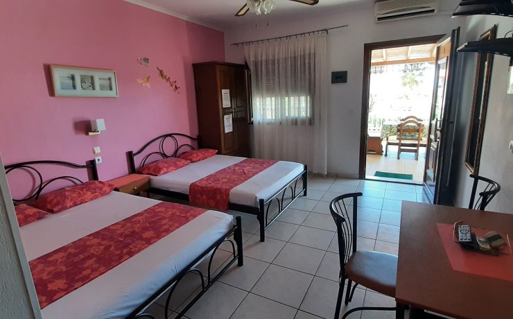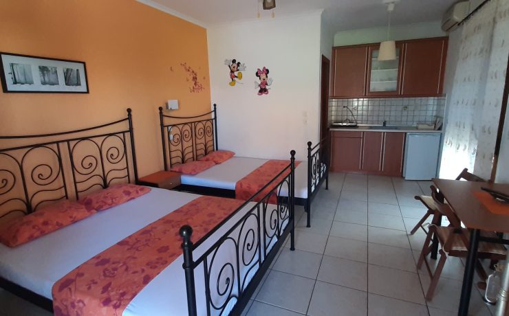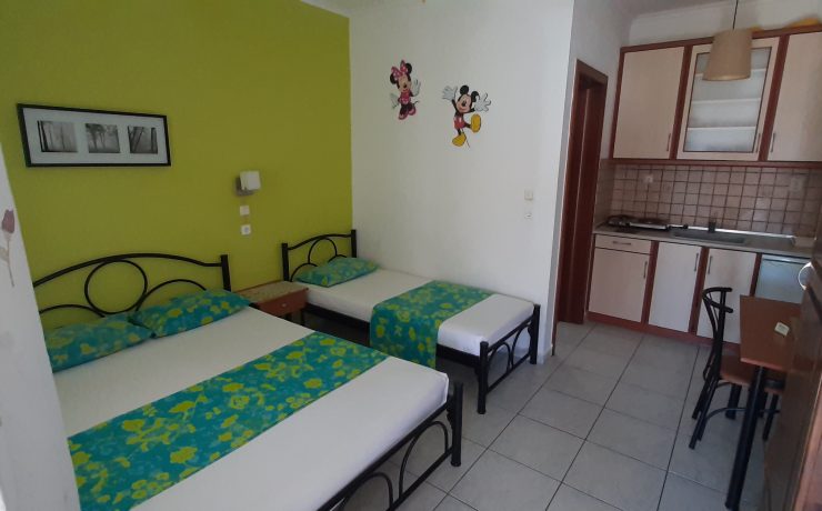 Studiji raspolažu kompletno opremljenim kuhinjama (veliki frižider sa zamrzivačem, rešo sa dve ringle na struju, aspirator, mali toster, posuđe i pribor), kupatilo, dva francuska ležaja, orman, noćni ormarić, ogledalo, televizor, Wi-Fi internet (besplatan), klima uređaj (uračunato u cenu). Promena posteljine vrši se na polovini boravka, dok za vreme boravka higijenu u studiju održavaju gosti. Vila Tasos nema peškire.