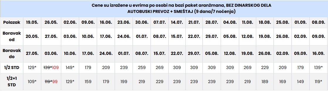 Kod akcijskih cena (označene crvenom bojom u tabeli), umanjenje za sopstveni prevoz je 20€, a umanjenja za decu nema