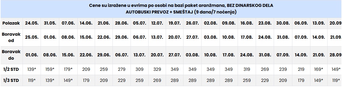 CENE SU IZRAŽENE PO OSOBI NA BAZI PAKET ARANŽMANA (smeštaj i prevoz) ZA POLASKE IZ BEOGRADA, NOVOG SADA I DUŽ AUTO PUTA.