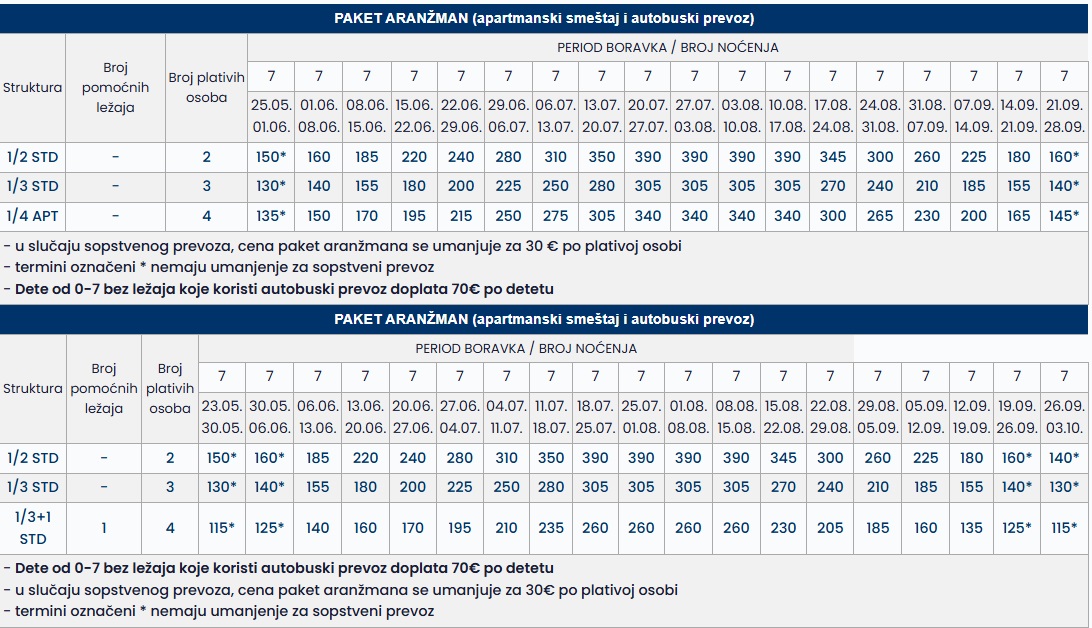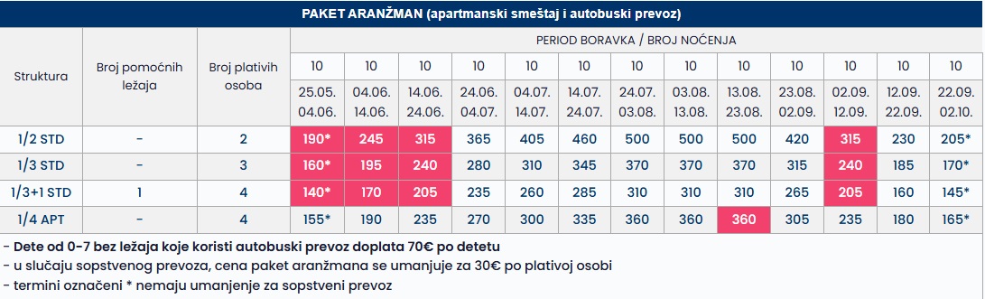 •Datum iz tabele se odnosi na period boravka. Polazak autobusa je dan ranije u odnosu na datum iz tabele.