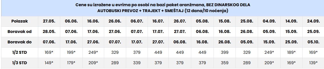 Cena aranžmana se umanjuje za 30€ po osobi, osim za predsezonu i postsezonu (smene označene*) gde se u slučaju korišćenja sopstvenog prevoza umanjuje za 20€.